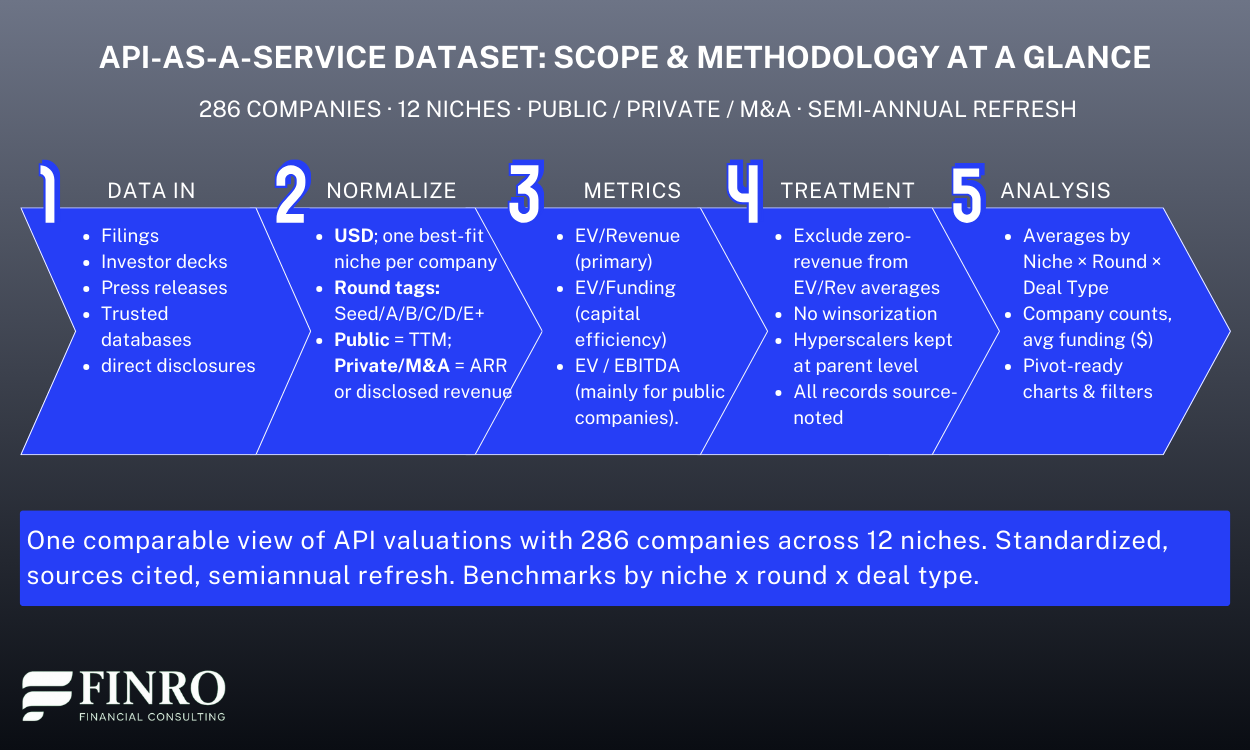 The cut includes 286 companies across 12 API-as-a-Service niches, spanning public comps, private marks, and M&A prints.