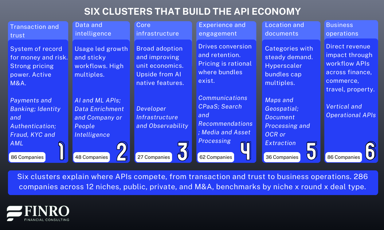 Along the way, we spotlight the patterns behind the numbers—why Payments can sustain premiums at scale, why Identity and Fraud earn scarcity premiums, and why AI & ML APIs dominate the upper-right quadrant.