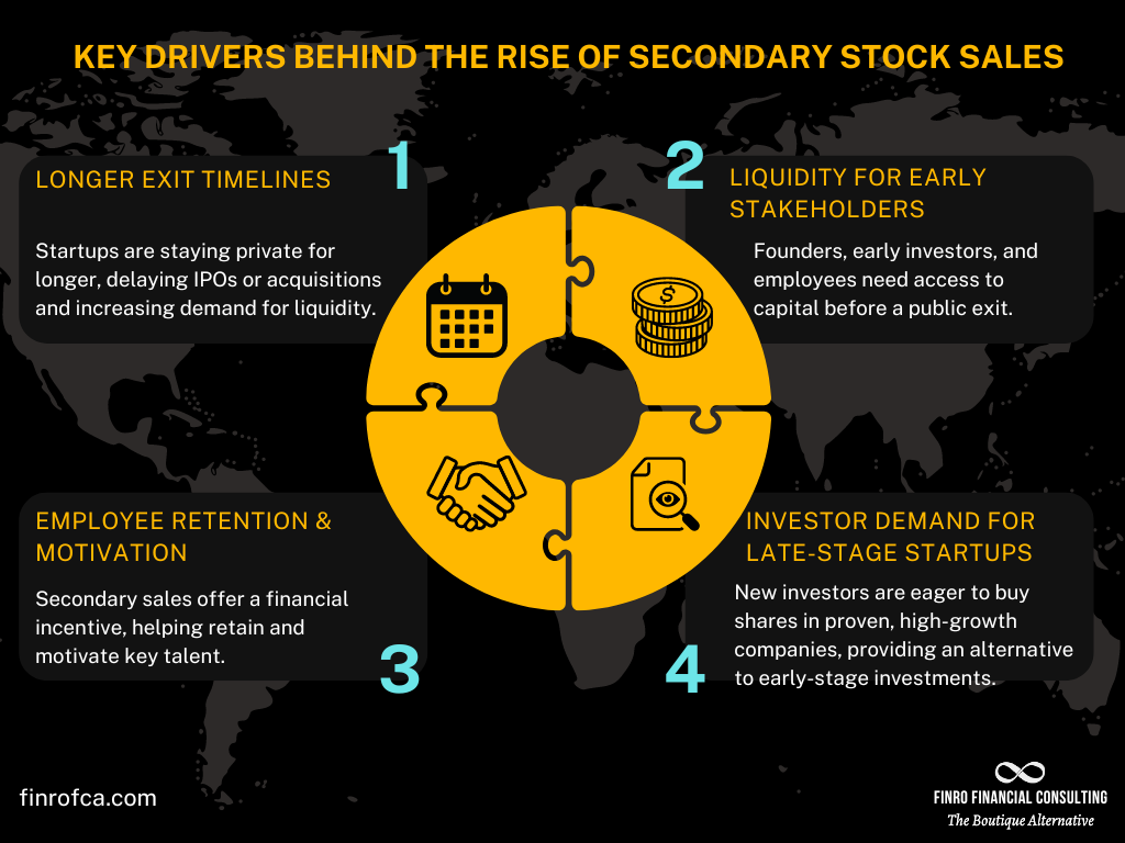 The rise of secondary stock sales is no accident. The longer timelines for exits, the need for liquidity among early stakeholders, and the increased interest from late-stage investors have all contributed to their growing importance in the startup ecosystem. Secondary sales have become a flexible tool that benefits both early shareholders and new investors while helping companies maintain employee engagement and attract fresh capital.