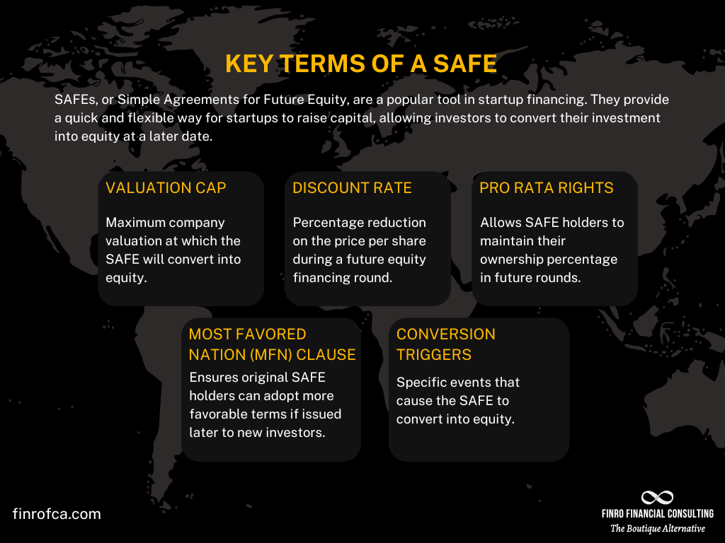 These key terms define the structure and benefits of a SAFE, ensuring both founders and investors have clear expectations and protections in place. Understanding these terms is essential for leveraging SAFEs effectively in startup financing.